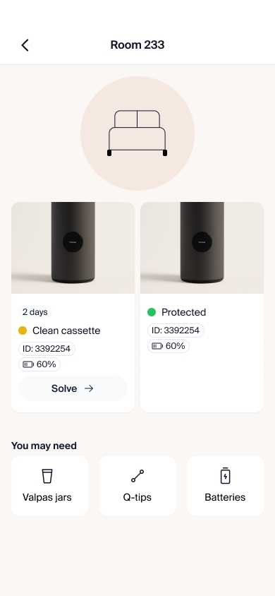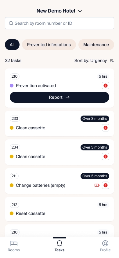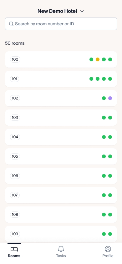 Pour accéder à des informations plus détaillées sur une chambre, appuyez sur celle-ci depuis la vue « Chambres » ou « Tâches ». Cela ouvrira la vue détaillée de la chambre, où vous pourrez consulter son état actuel ainsi que toutes les tâches qui y sont associées.