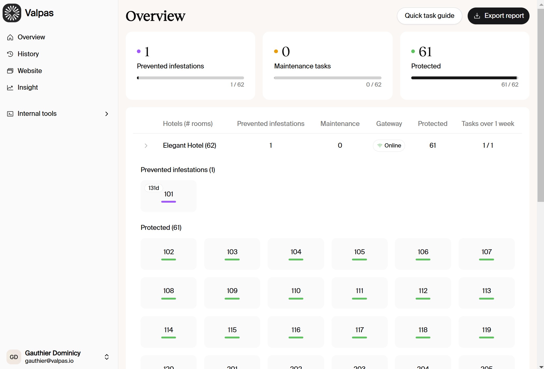 <figure><img src="https://content.gitbook.com/content/whCHHt1qbRFa6a9h9T1R/blobs/3AJMP6gLyBreAtNjXEF1/Screenshot%202025-06-03%20150439.jpg" alt=""><figcaption><p>Hotel "Overview" tab in Valpas web dashboard</p></figcaption></figure>