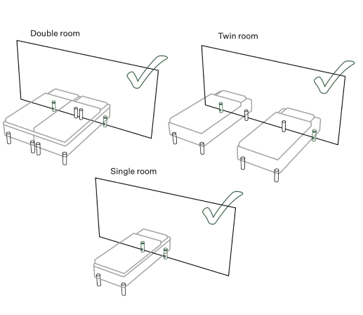 ベッドが部屋の角に寄せられていて二辺が壁に接している場合は、点検しやすくするために壁側の角ではなく部屋側を向いた角にスマートレッグを取り付けてください。