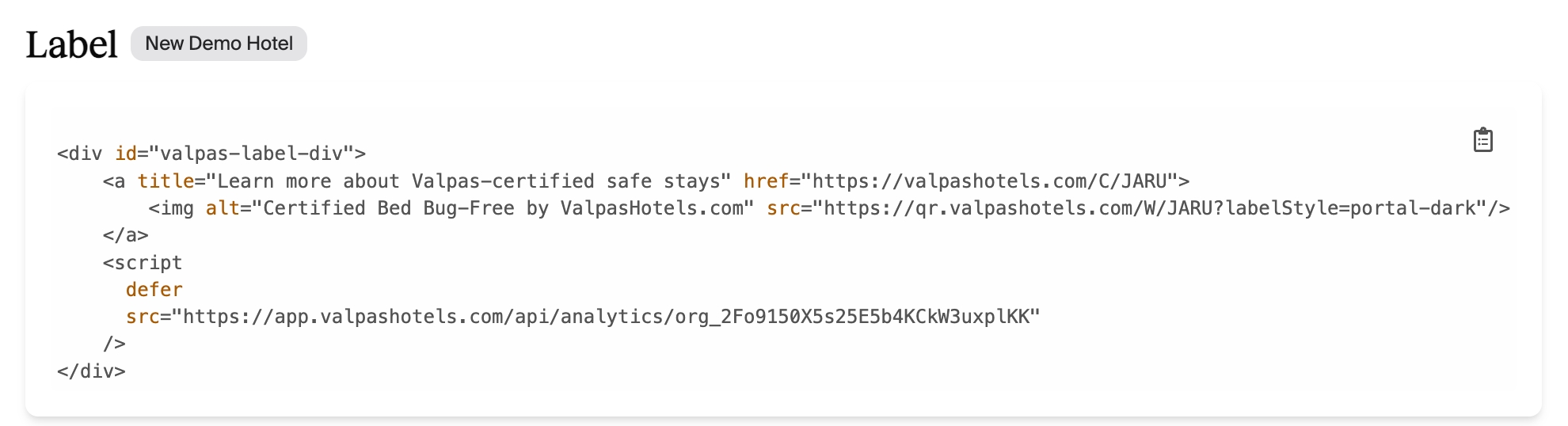 色を選択したら、生成されたコードをクリップボードにコピーしてください。このコードはあなたのホテルごとに固有で、ウェブサイトにValpasラベルを表示するために必要です。